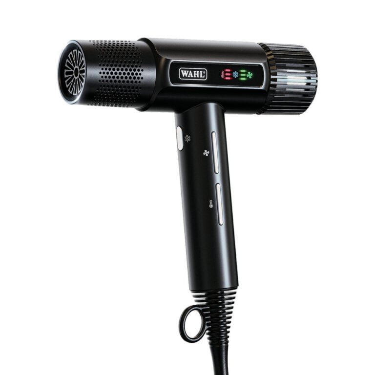 The Babyliss Pro Blue Lightning is an air styler with two speed settings. The round brush has an aluminum body with a diameter of 32 mm, an insulated tip, a removable cleaning filter, a cable with a swivel joint, and 700 watts of power.